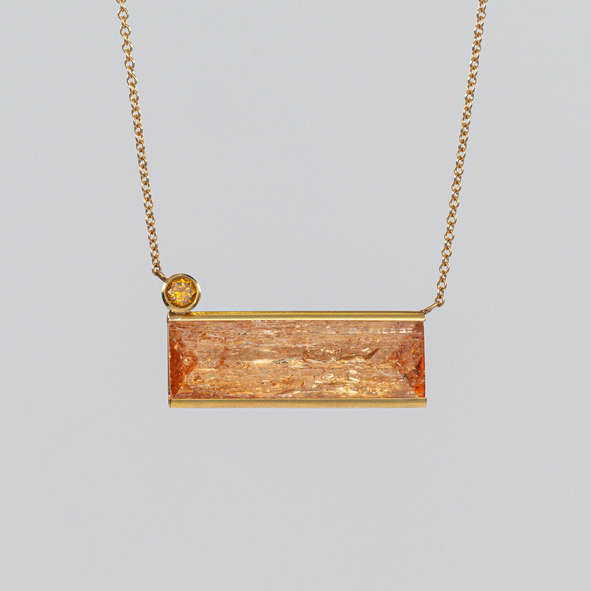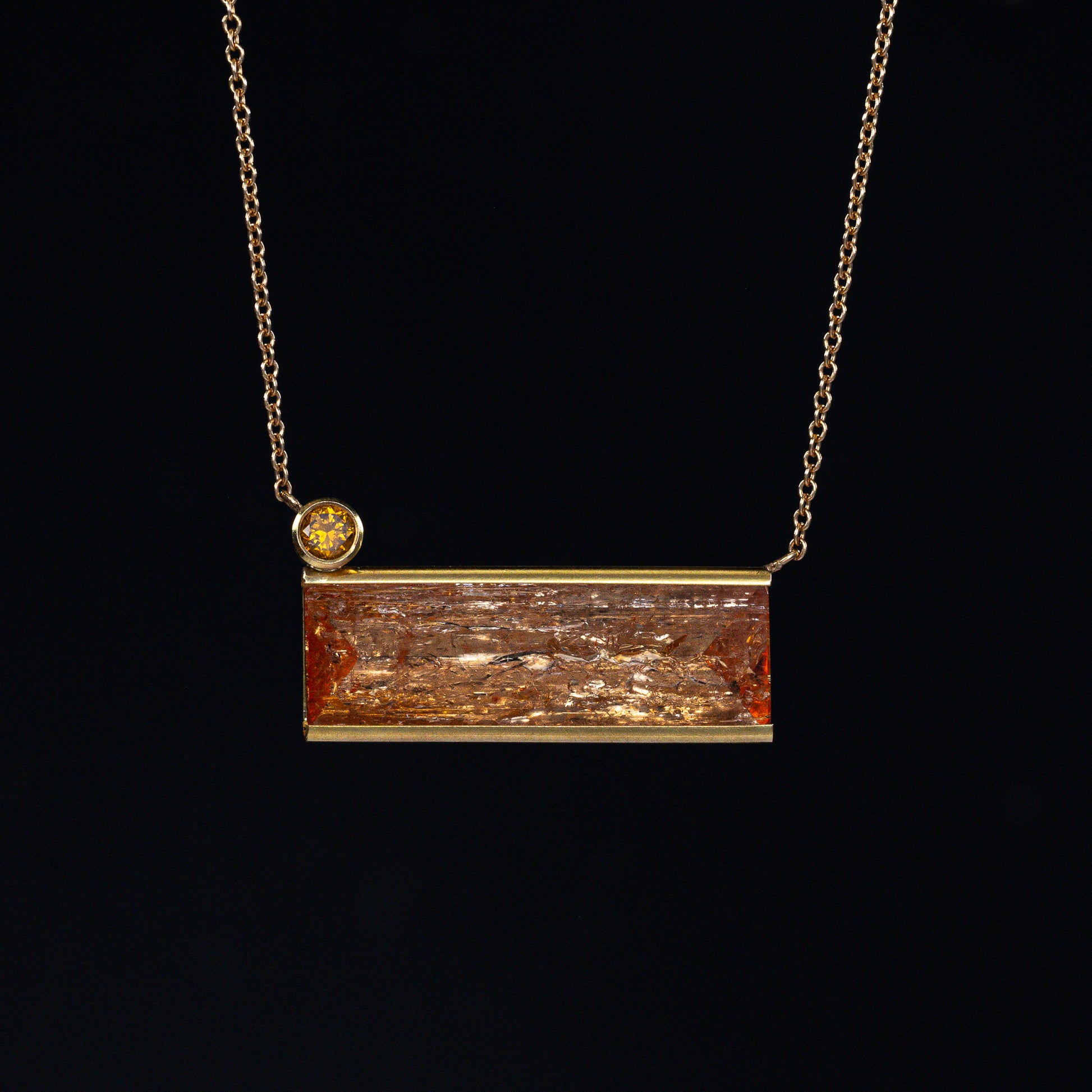 One of a kind 14k yellow gold necklace with a bezel set 10.50ct table cut, naturally included orange Imperial Topaz, accented with a natural fancy color orange diamond (0.12ct) offset in a bezel. The chain is 18 inches long.