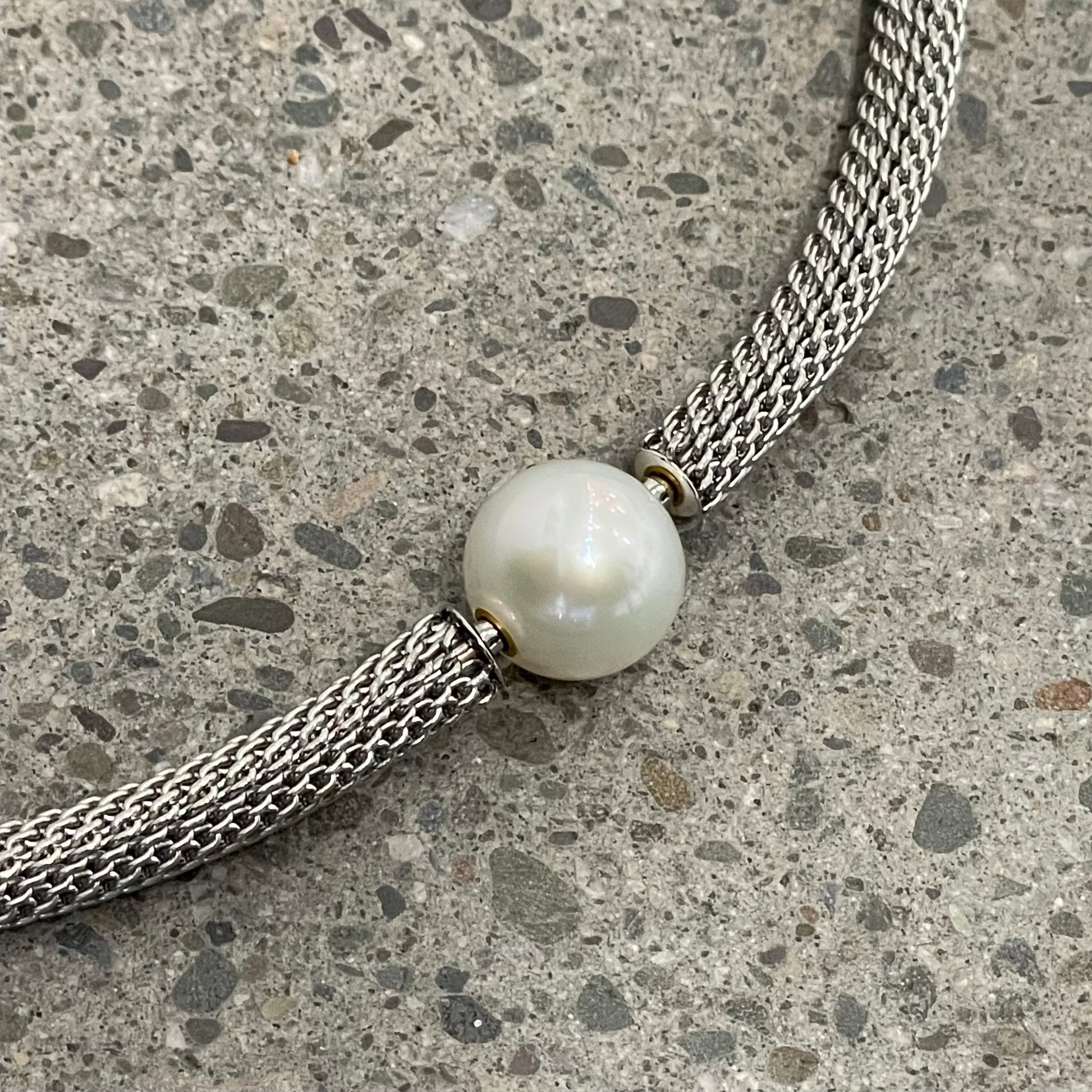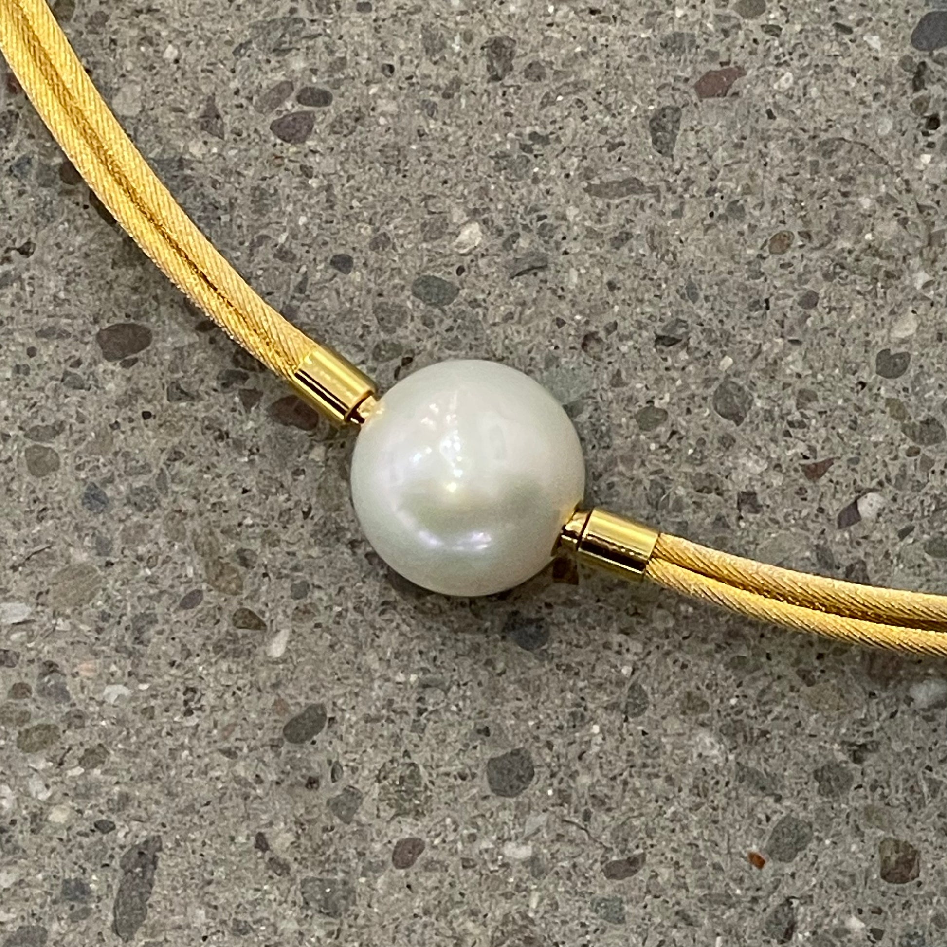 A classic choice for any Vario neck cord or chain, for any occasion. 14mm lustrous white freshwater pearl clasp with gold plated stainless steel Vario mechanisms.