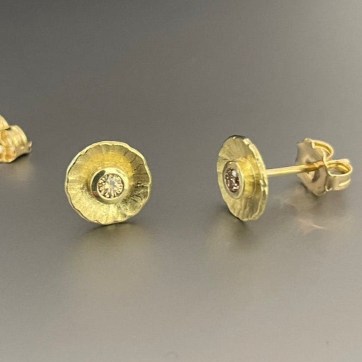 Hammer textured and burnished 18k yellow gold post earrings with natural warm champagne diamonds (0.11ctw). They measure 8mm (0.31") in diameter.