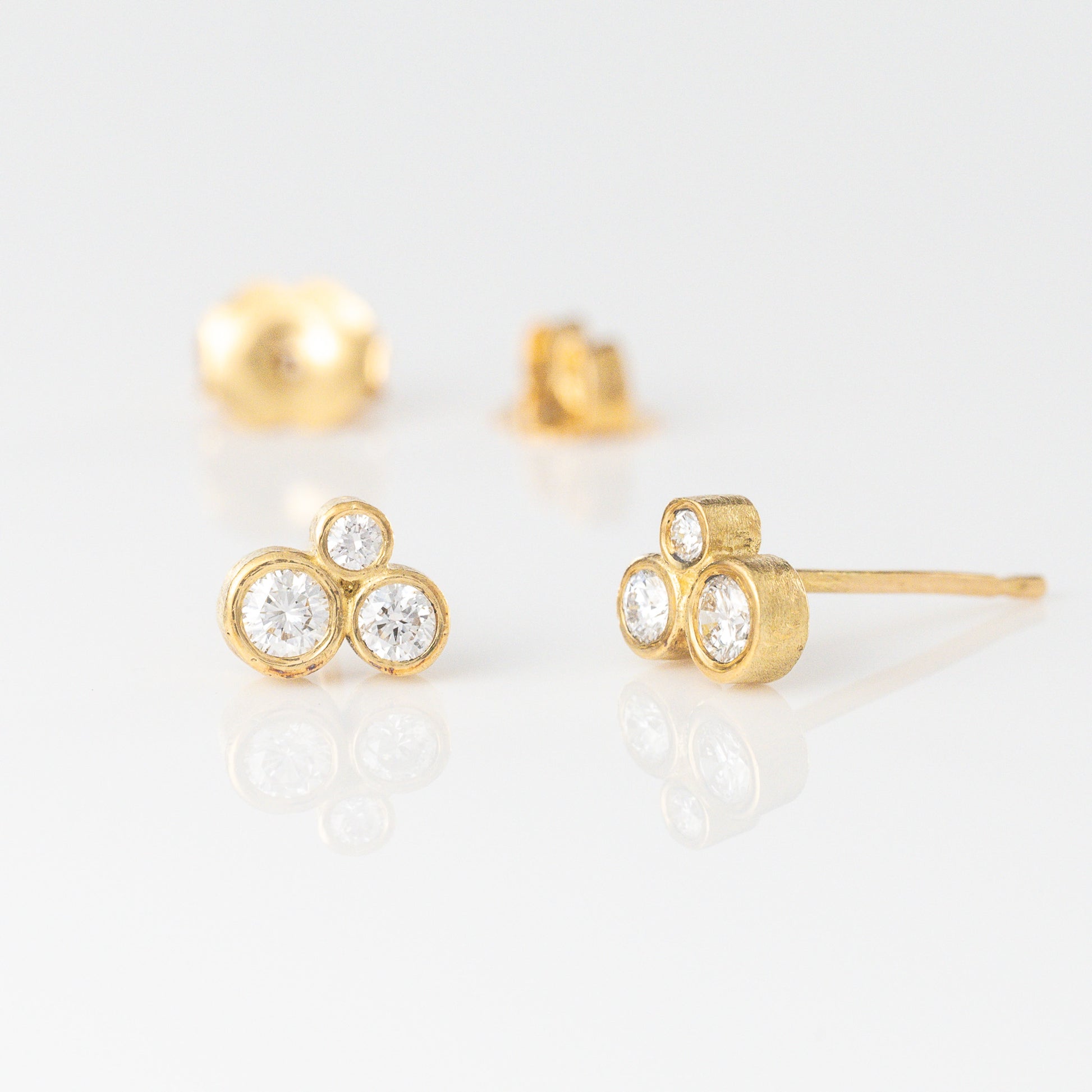 Clusters of tapering sized white diamonds (0.28ctw GH/VS-SI) are bezel set in 18k yellow gold. They measure approximately 7x5mm.