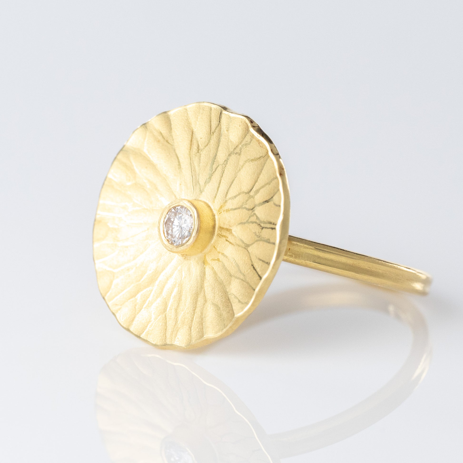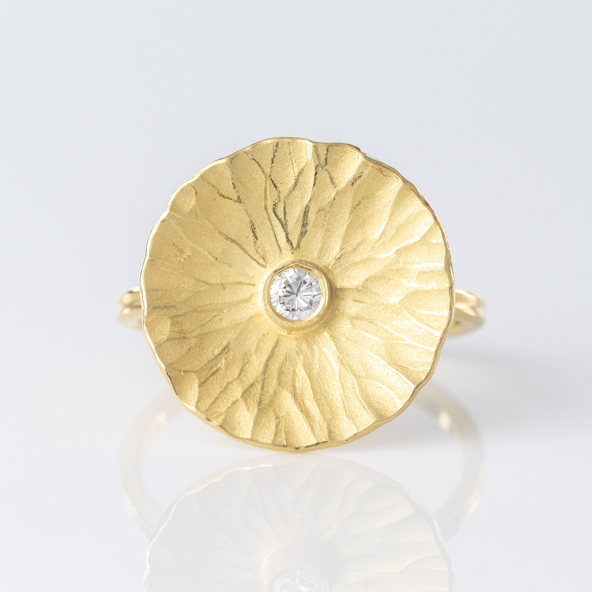 18k yellow gold fabricated and hammer textured Radiant Ring (16mm) with 0.08ct Reclaimed Nature natural G-H VS1 white diamond on a textured band. Size 7.