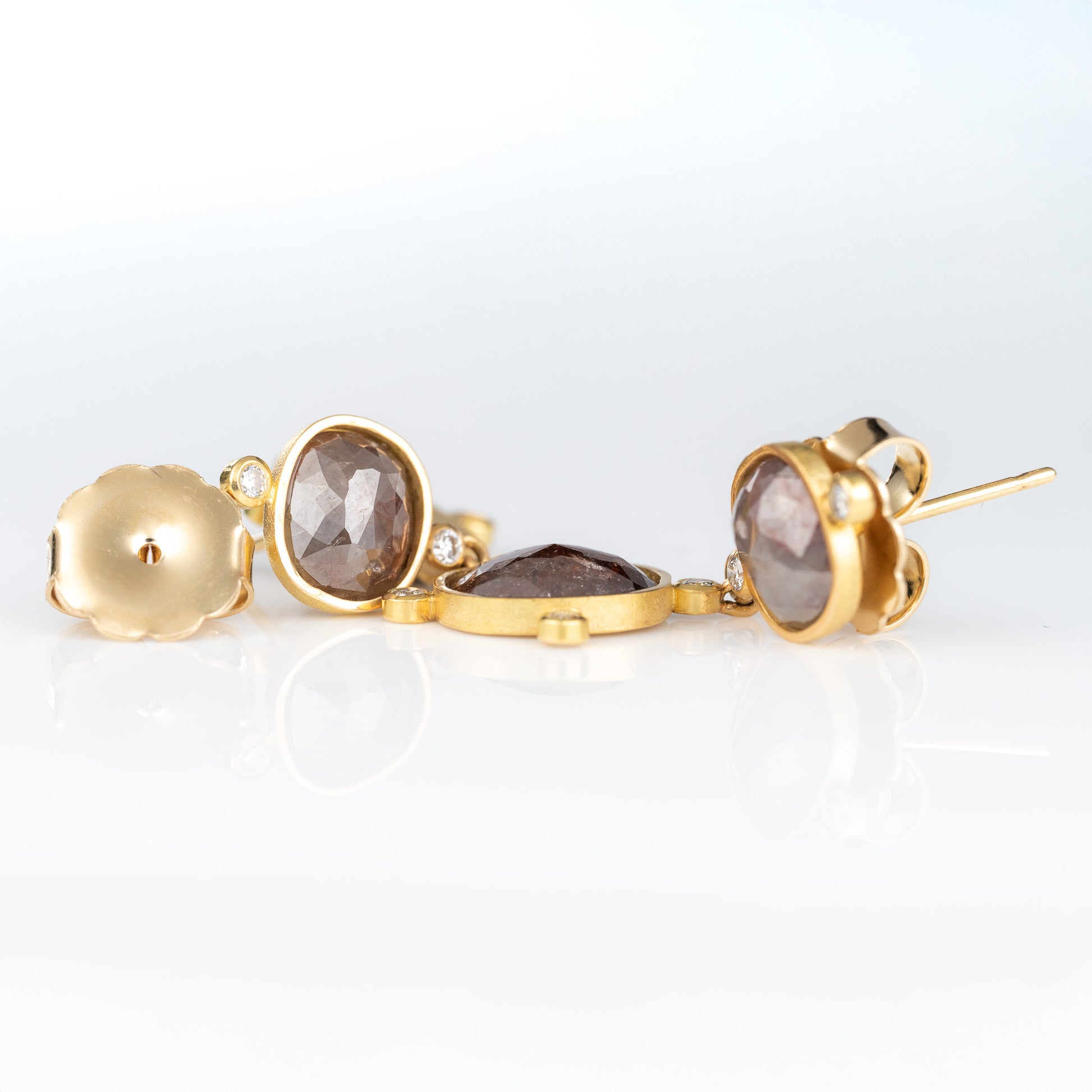 Rose cut, opaque reddish-brown raw diamonds (6.55ctw) are bezel set in 18k yellow gold with 12 surrounding Australian diamond accents (0.36ctw). These post earrings have large backs and measure approximately 1 1/8 inch in length.