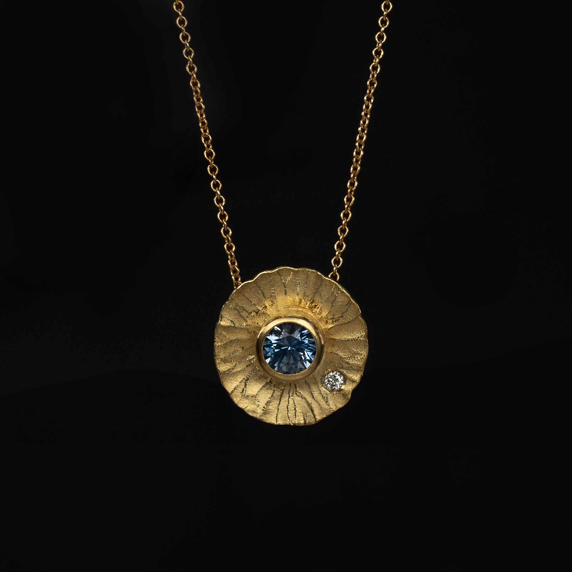 Hammer textured 18k yellow gold Radiant Pendant with a bezel set deep blue-purple Montana sapphire (0.58ct) and Australian diamond accent (0.03ct). The pendant measures 16mm (approx 5.8") in diameter with double loops for the 18 inch long, 18k cable chain.