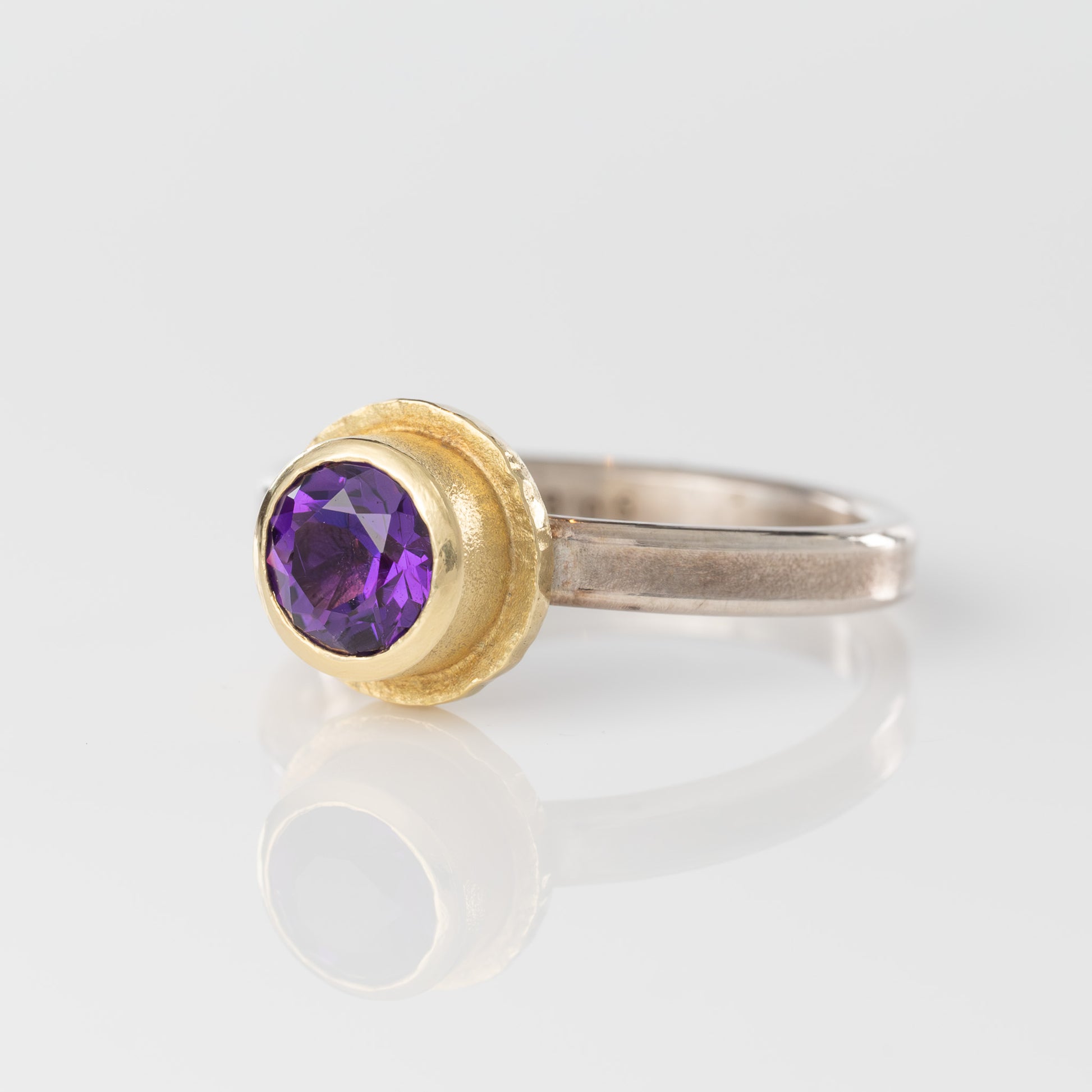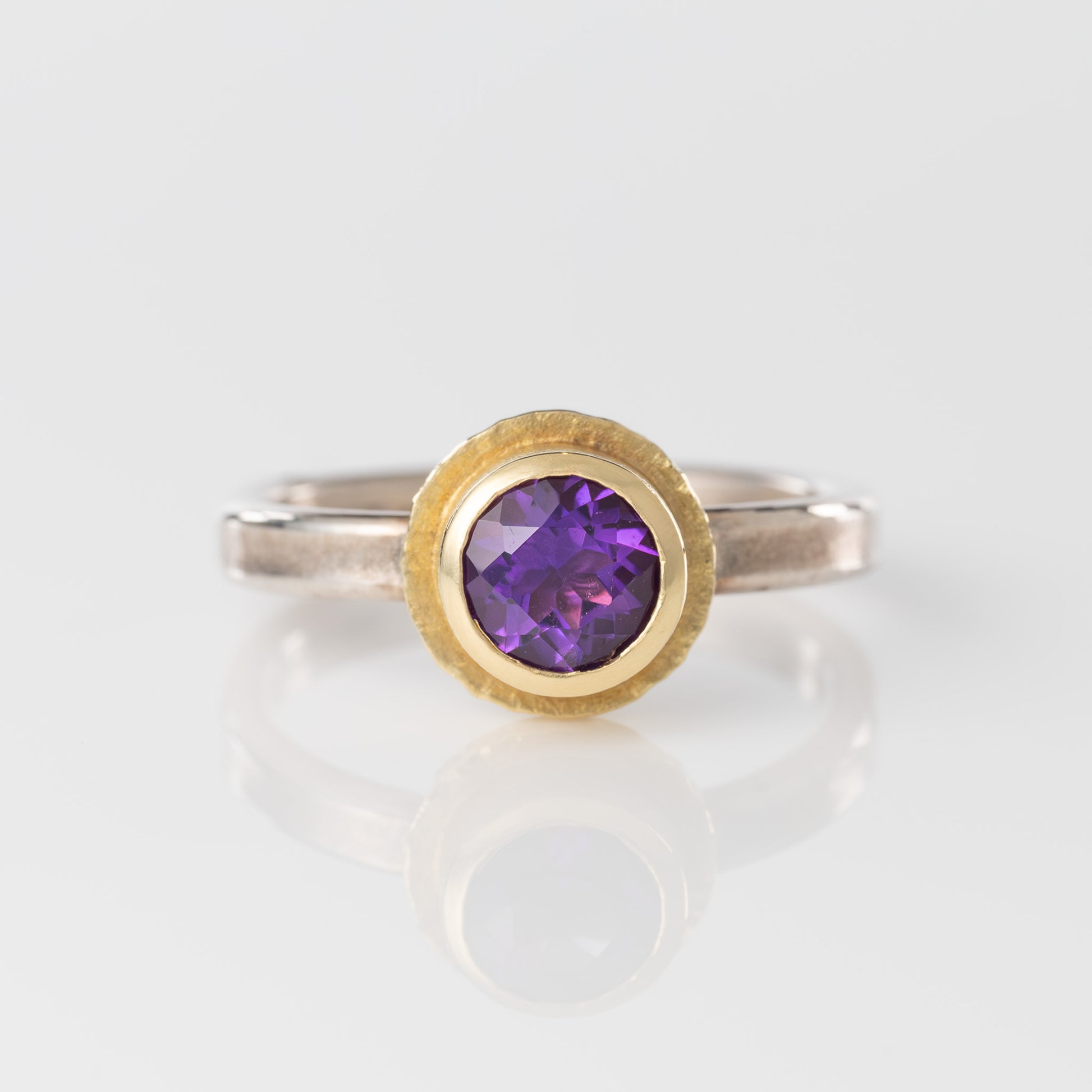 A bright, round faceted Amethyst (0.70ct) set in an 18k yellow gold hammered edge bezel on a 2.7mm wide sterling silver shank. Size 7.