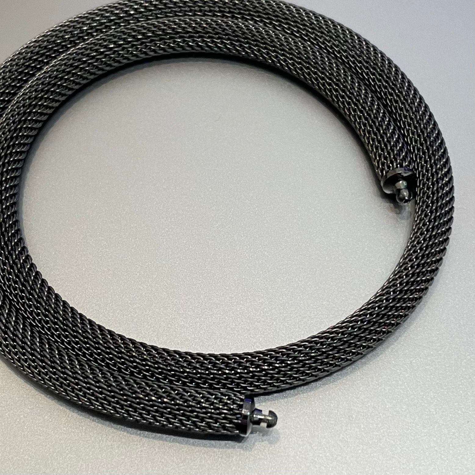 A 6mm Anthracite PVD coated stainless steel mesh neck cord for a bolder look or larger clasps. Smooth and comfortable to wear, the mesh has enough flow to lay nicely on the neck. Mix and match with your favorite Vario clasps!