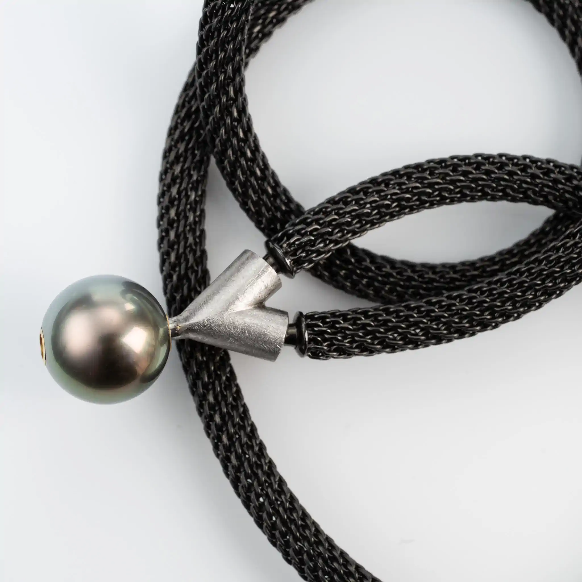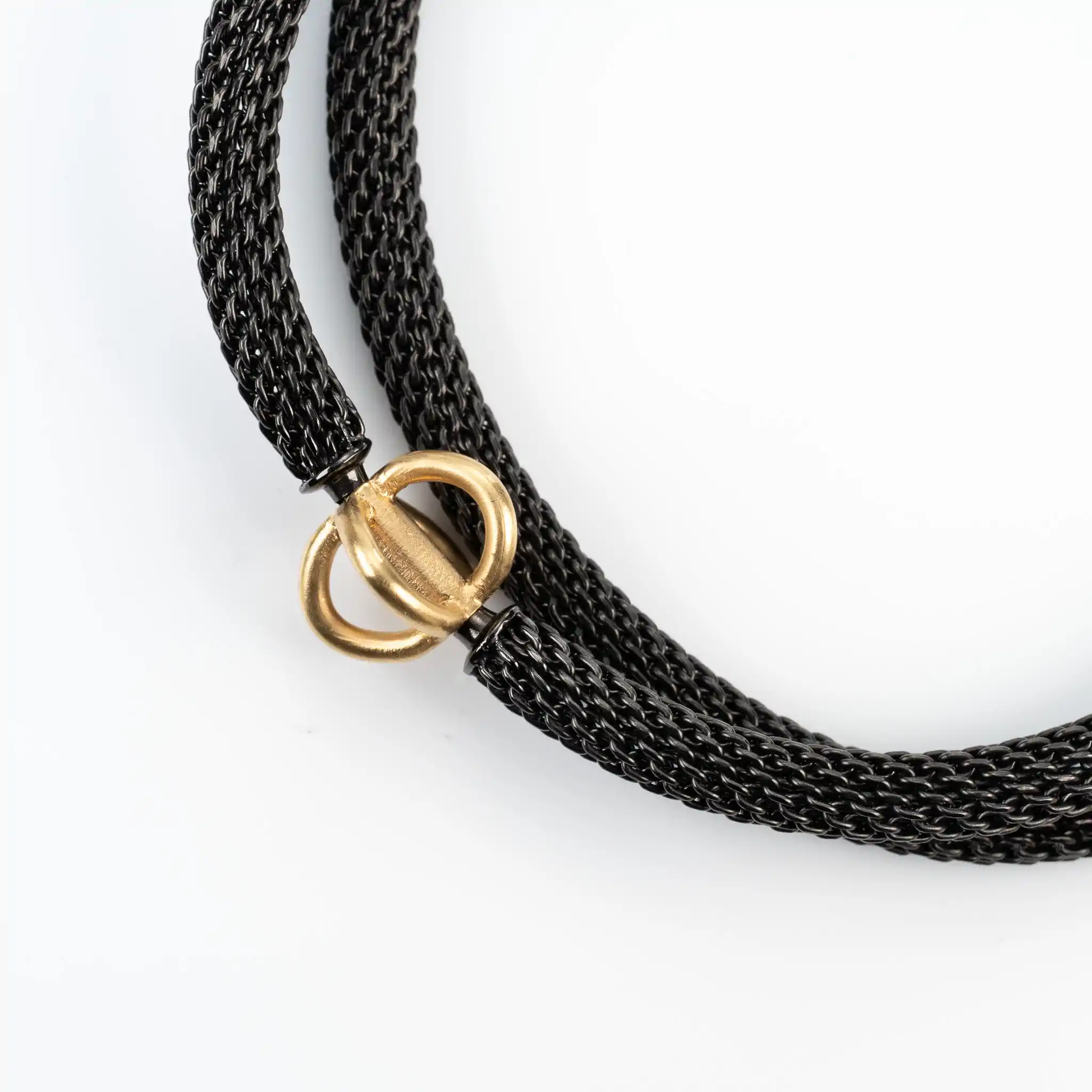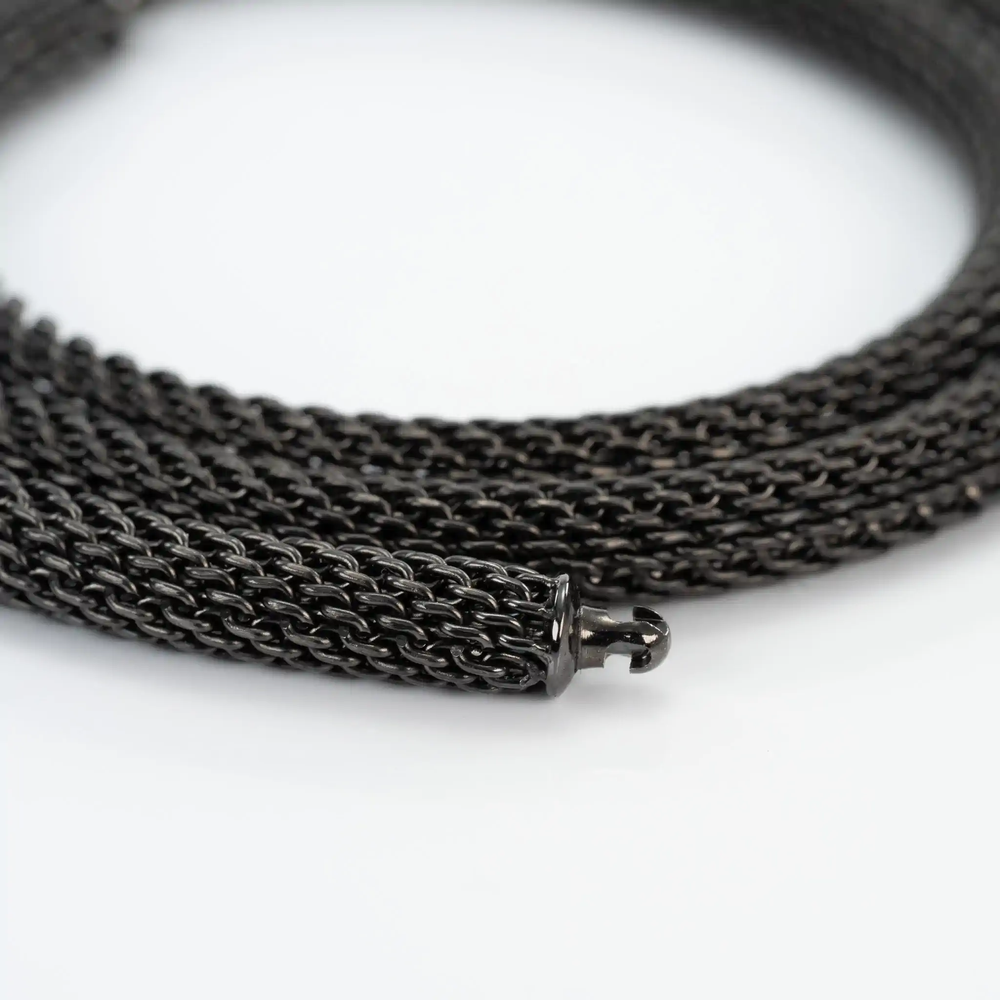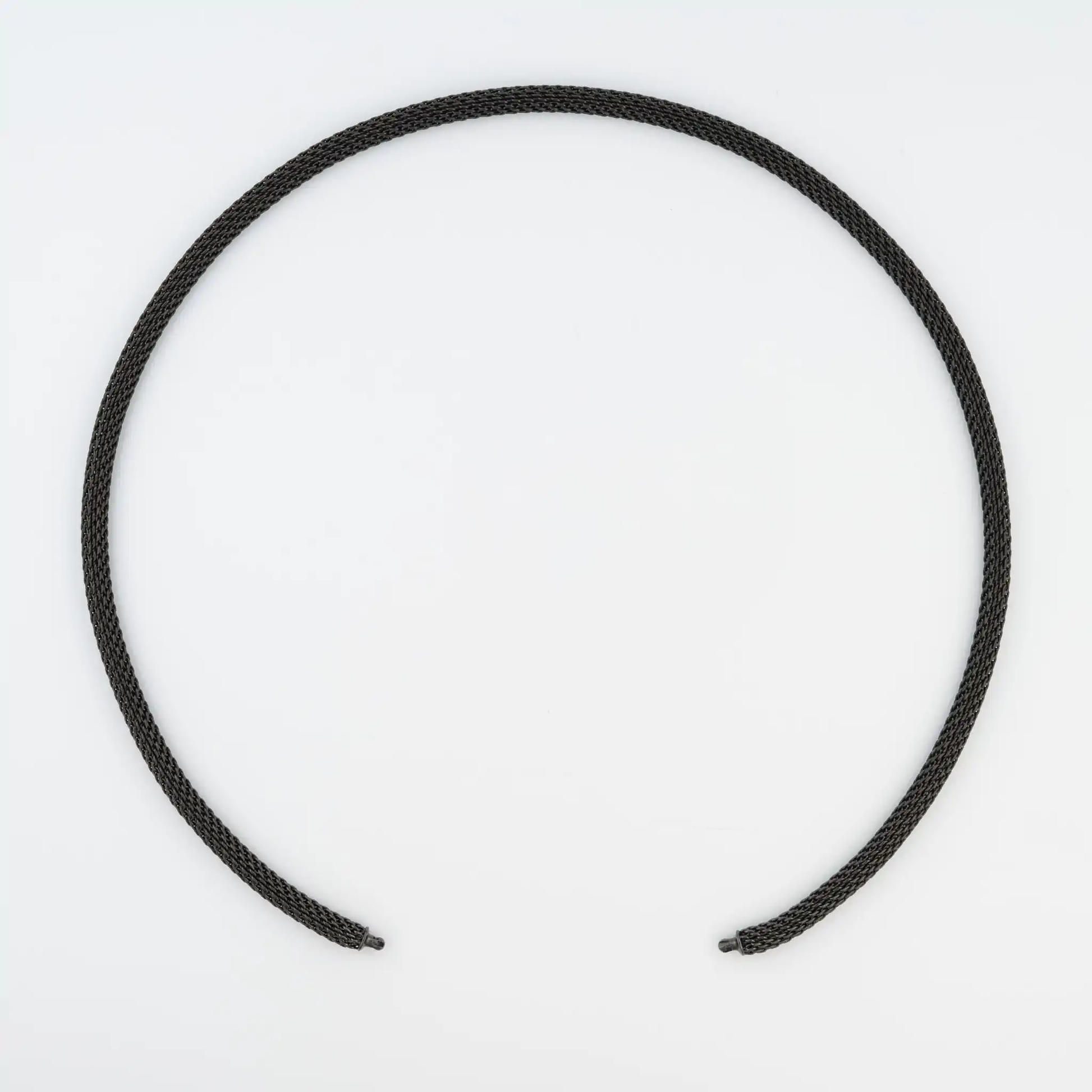 Anthracite (a rich dark grey, almost black) PVD coating on stainless steel, 5mm diameter, 18" (45mm) long. This neck cord partners with any Vario System clasp or connector in our collections. Mix and match to create your own signature combinations.