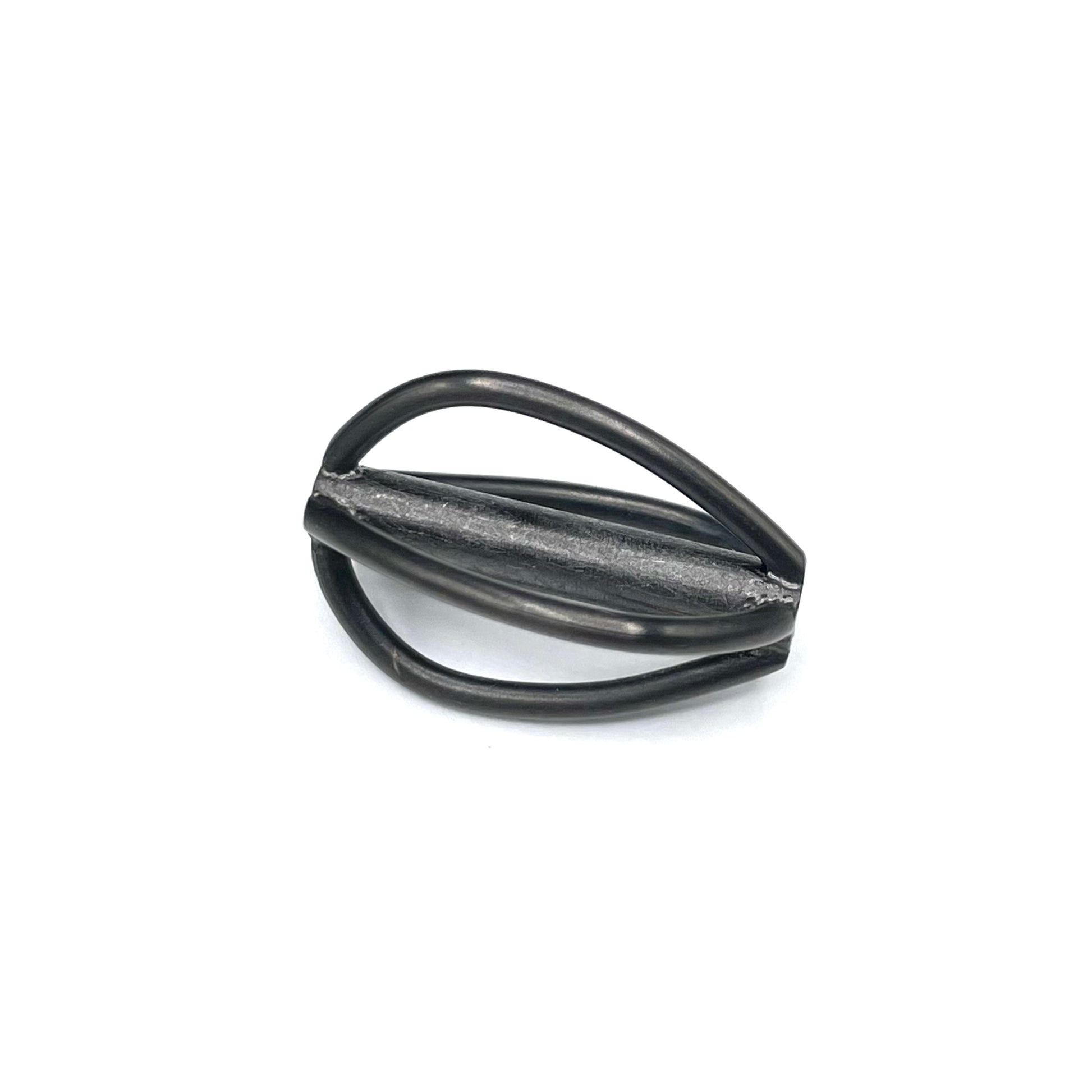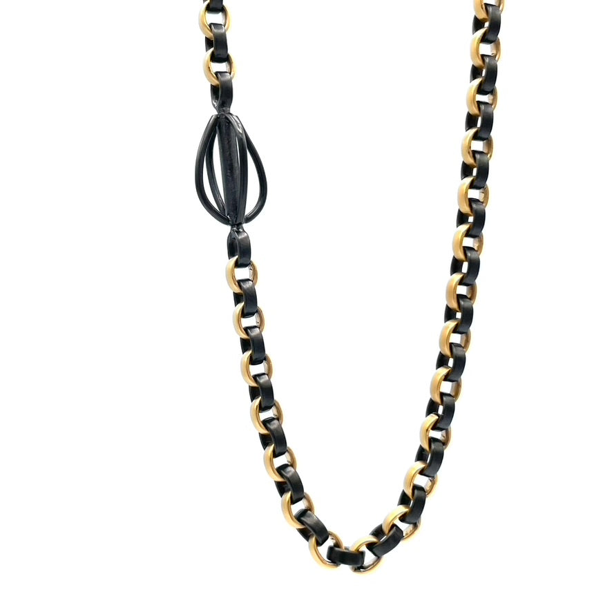 Anthracite PVD coating over stainless steel. The opposing curves of this handcrafted cage offer the illusion of a twist. This is the largest size of the Cage series Varios, at 20mm long (0.80 inch). Well paired with Vario chains, mix and match with your favorite Vario neck cords.