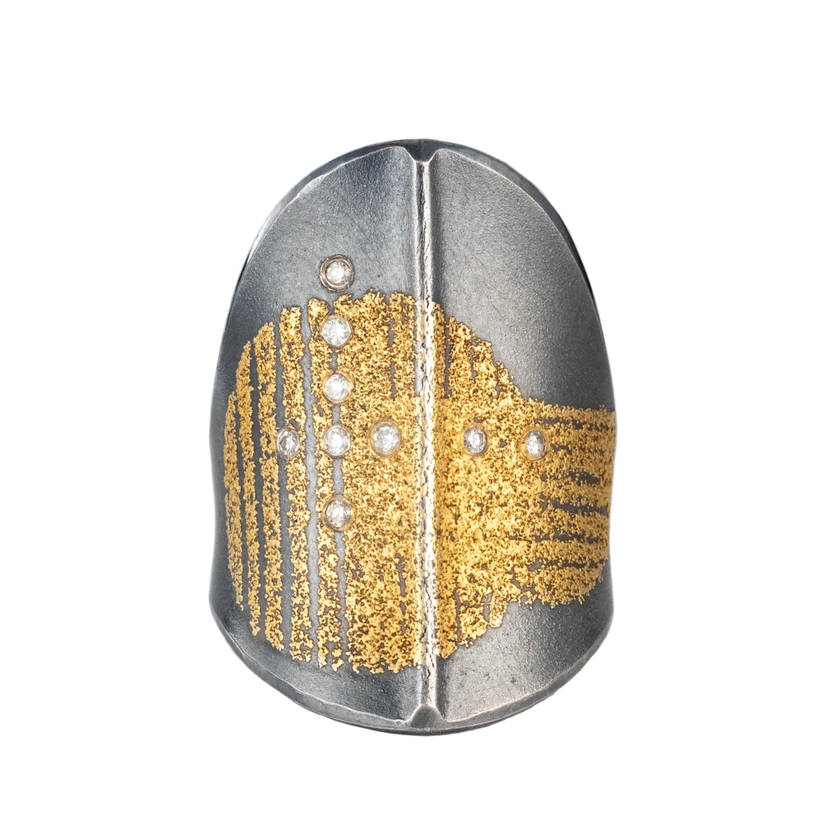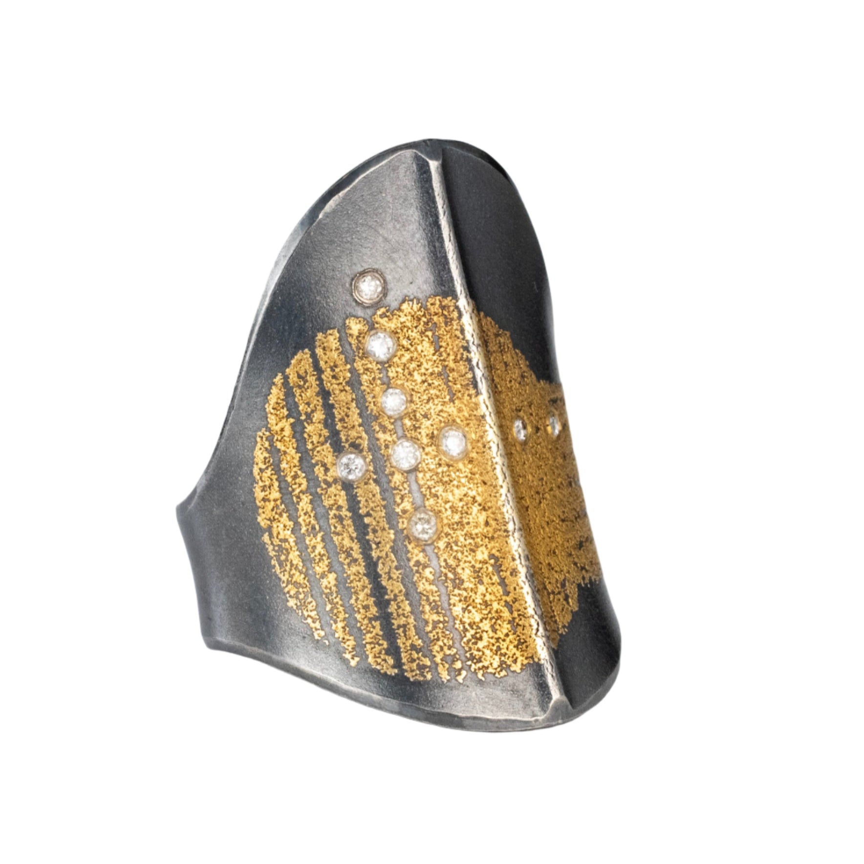 Deco Spline Ring in Sterling Silver, 24k Gold and White Diamonds