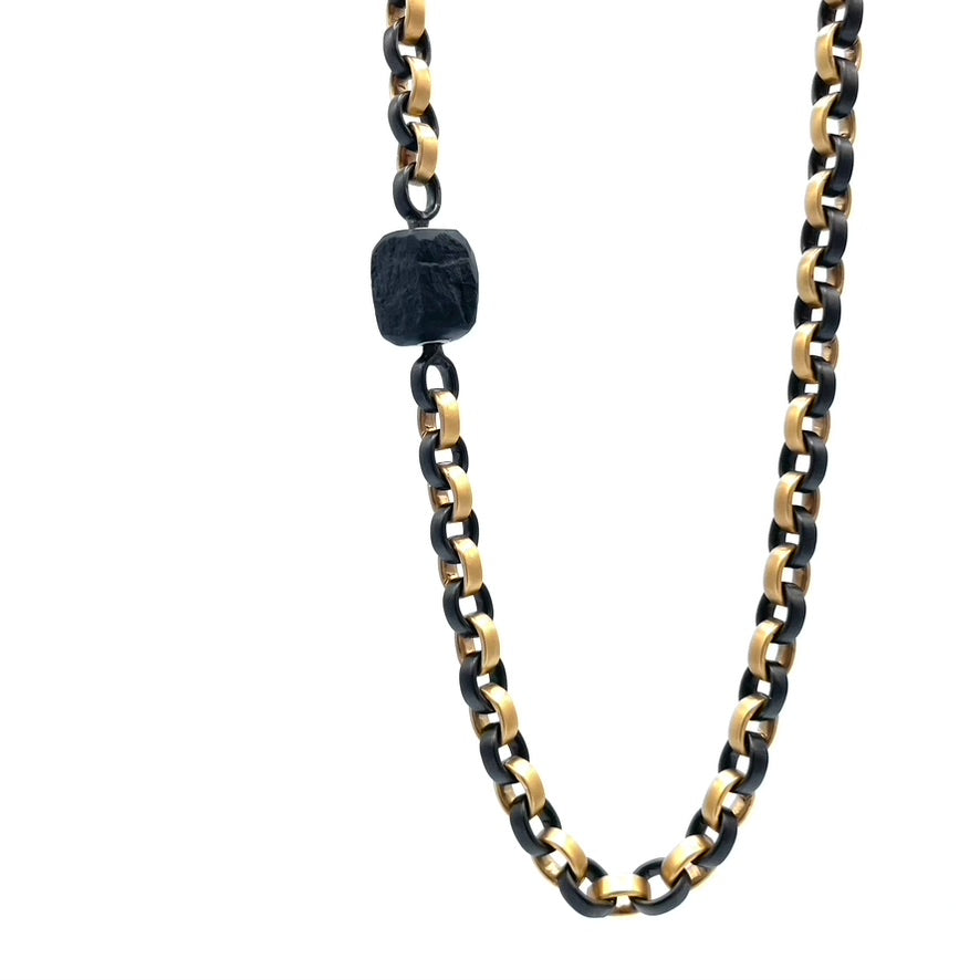 Granite nugget with stainless steel Vario mechanisms. 11mm x 10mm and 13mm(0.50 inch) end to end, this is a smaller version of the stone nugget Vario. Raw Nature, refined. Pair with your favorite Vario neck cord or chain.