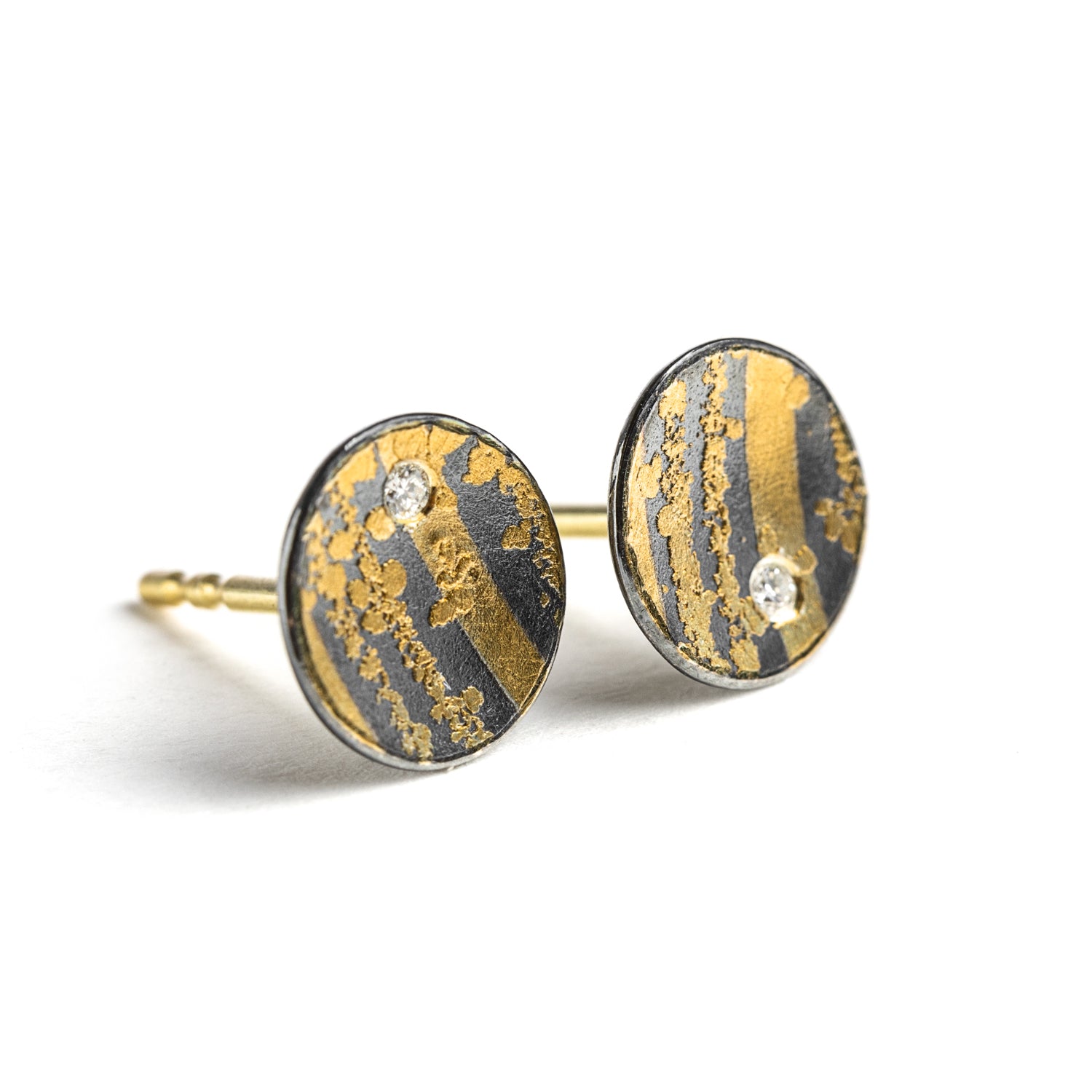 Oxidized sterling silver and 24k gold concave disc earrings with 0.02 TCW diamond accents. 18k gold posts with sterling silver earring backs. Diameter 0.35 in.