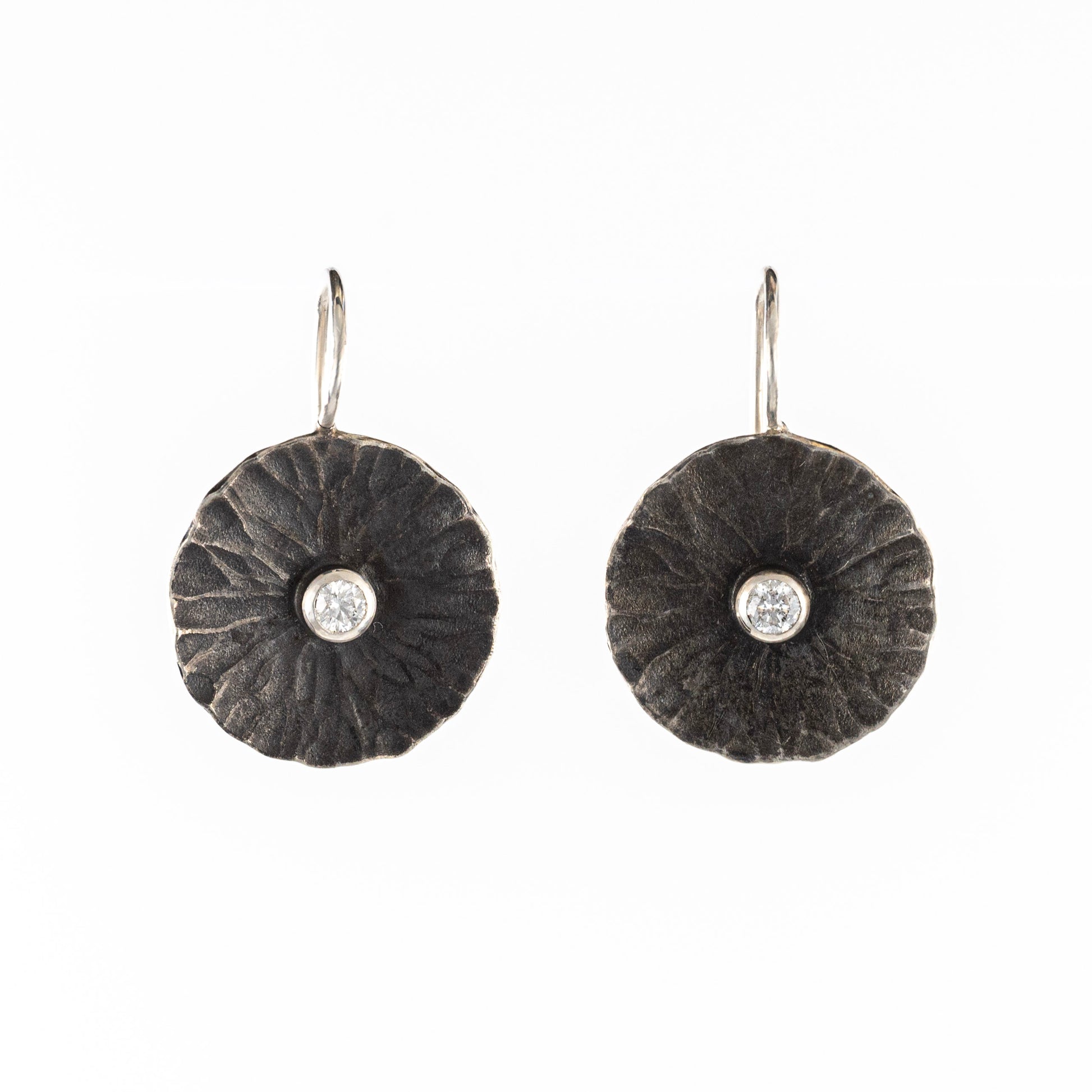 Hammer formed and oxidized sterling silver Radiant Drop Earrings on French wires, with 0.17 CTW bezel set Australian SilverMist diamonds. 17mm (0.67 in.) diameter and an overall length of 24mm (0.95 in.).