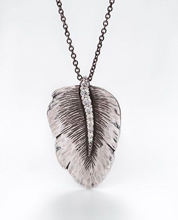 The Pure Flight SemiPlume Pendant is crafted of 100% reclaimed/refined sterling silver and features 9 SilverMist Diamonds (0.41 ctw) responsibly mined in Australia. The sterling silver cable chain is 18" long and the feather element measures approximately 1 3/8 by 7/8 inch.