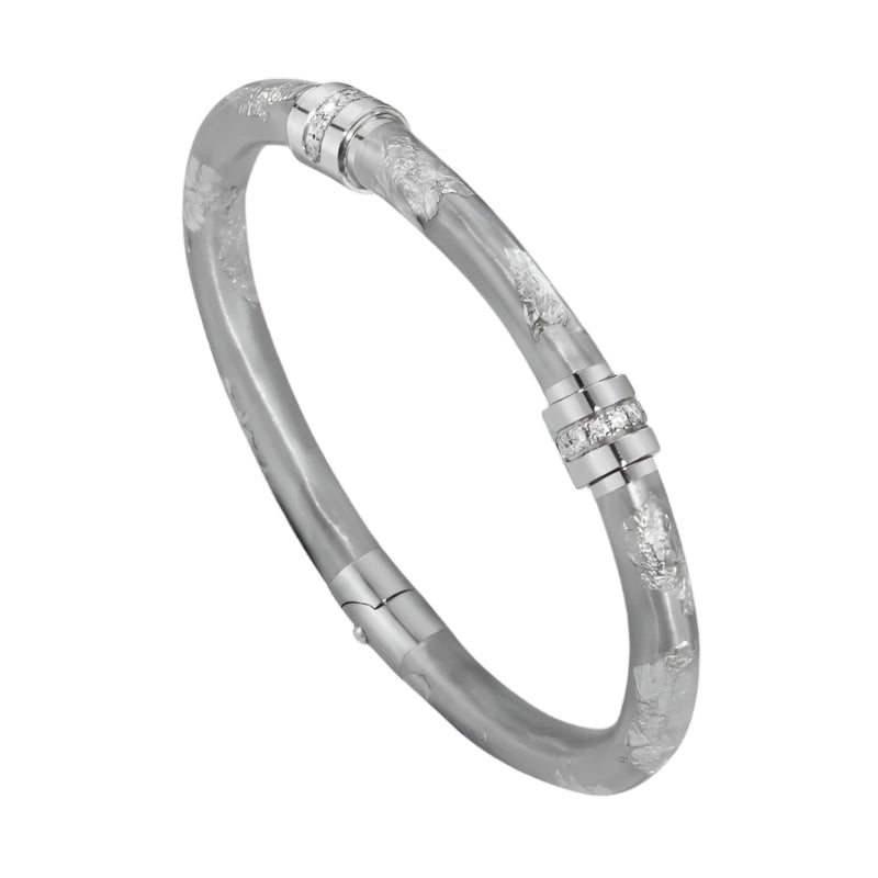 Textural layers of silver enamel, white gold leaf, and clear enamel over sterling silver. This hinged bangle is handcrafted in Italy, and is the ultimate meeting of the ancient art of Etruscan enamel and modern style. Wearable luxury.