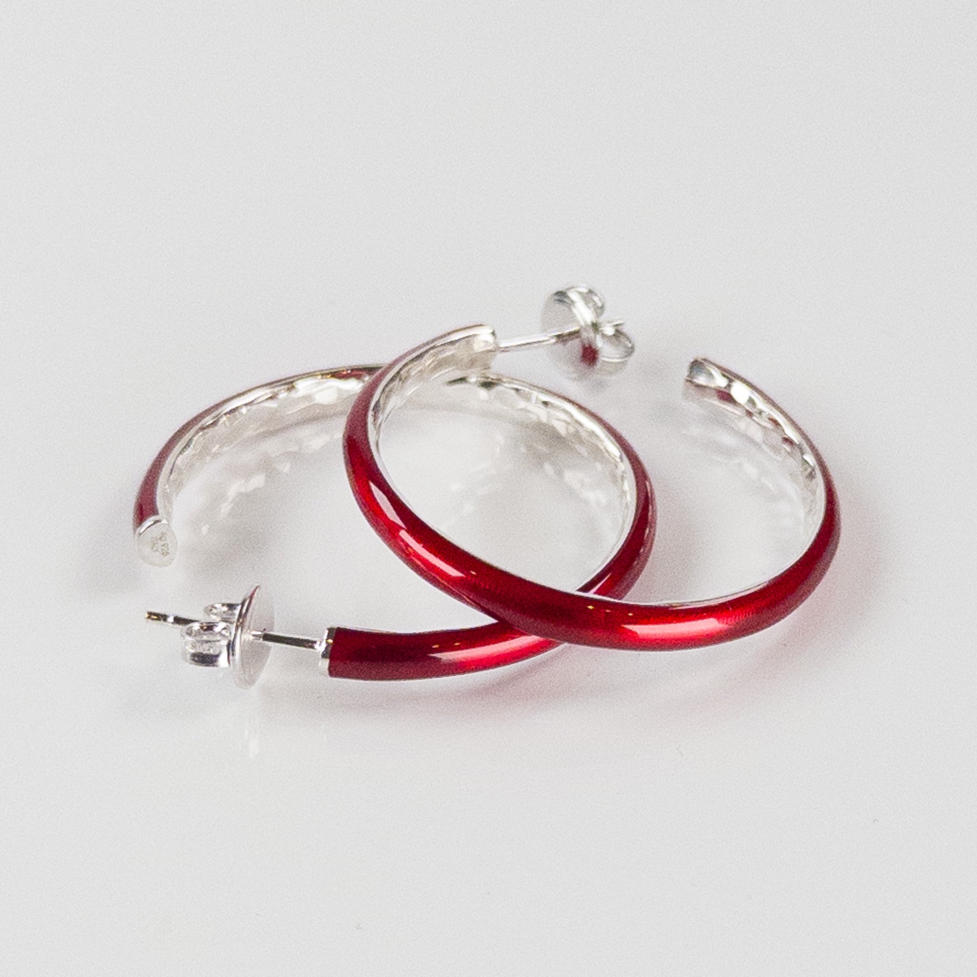 SOHO Sterling Silver and Ruby Red Enamel Post-Style Hoop Earrings with Hammered Detail (Medium)
