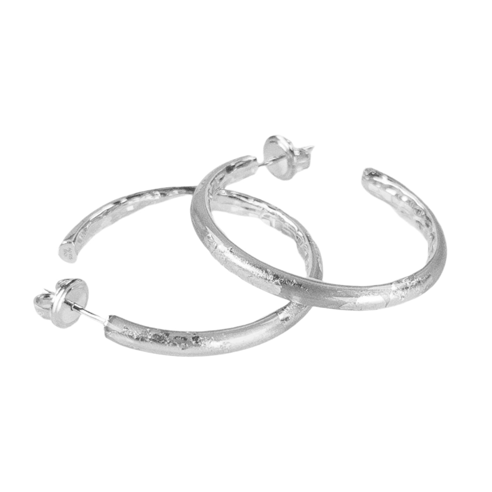 Intriguing texture is created with layers of silver enamel, white gold leaf, and clear enamel over sterling silver. The inside of the hoops feature hand hammered detail. These earrings are handcrafted in Italy, fusing modern elegance with the ancient Etruscan art of enamel. Effortless luxury.