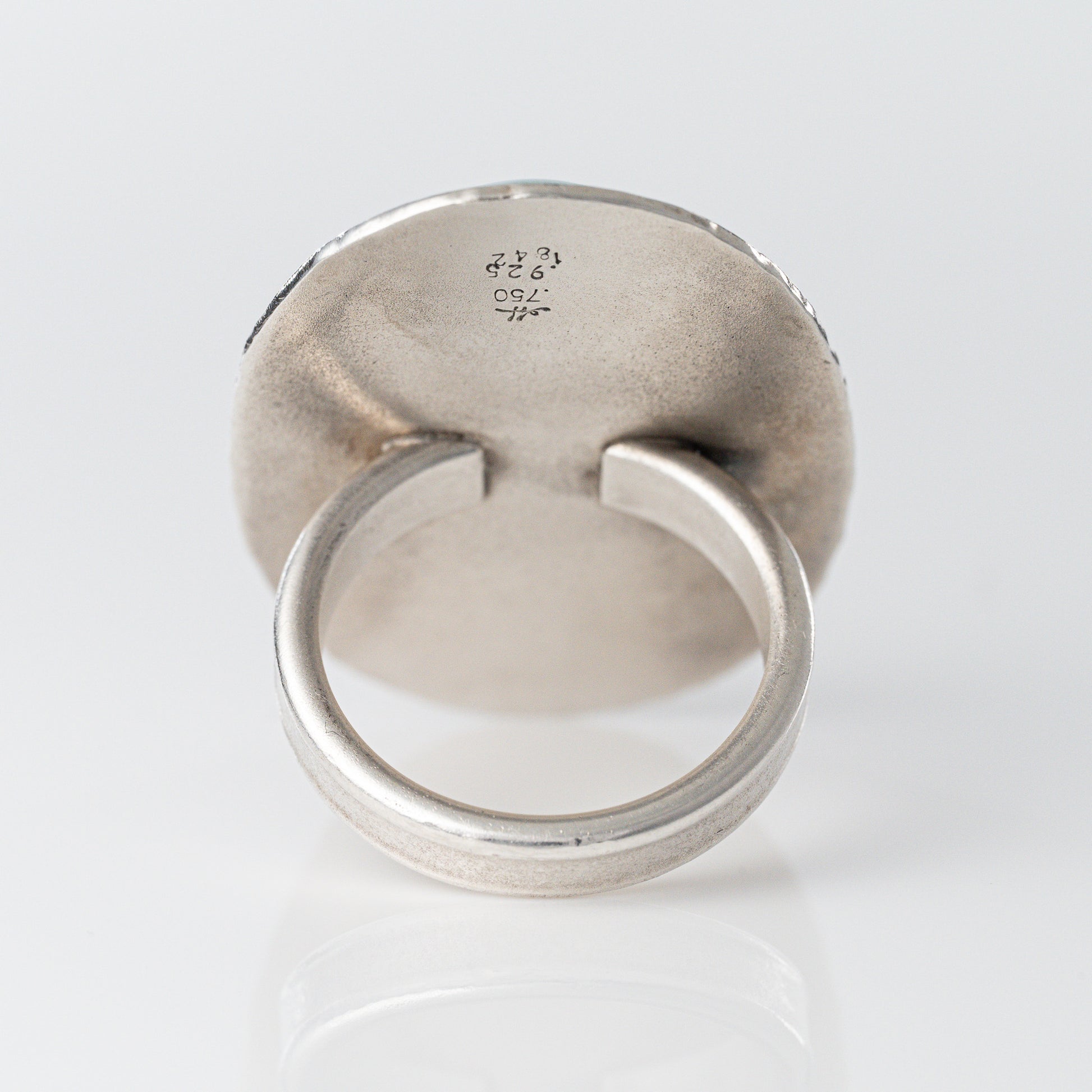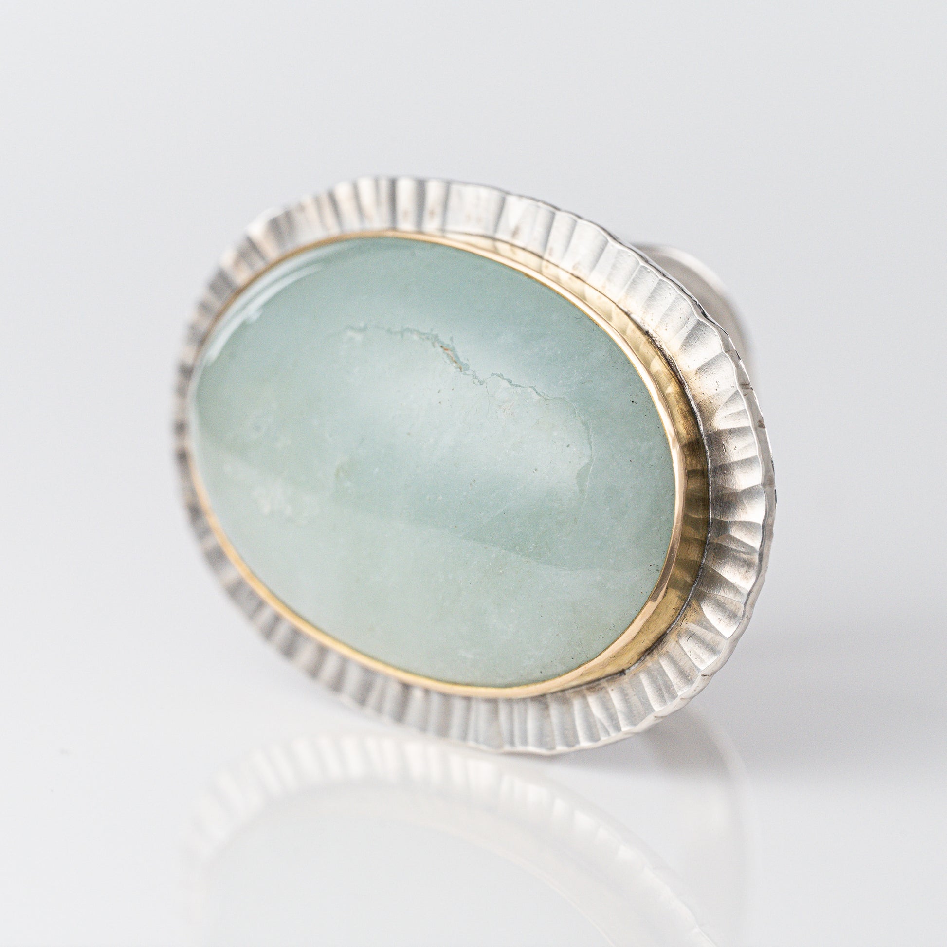 Sterling silver hammered and fabricated ring with an opaque, 20x30mm Aquamarine cabochon bezel set in 18k yellow gold. Size 8.25.