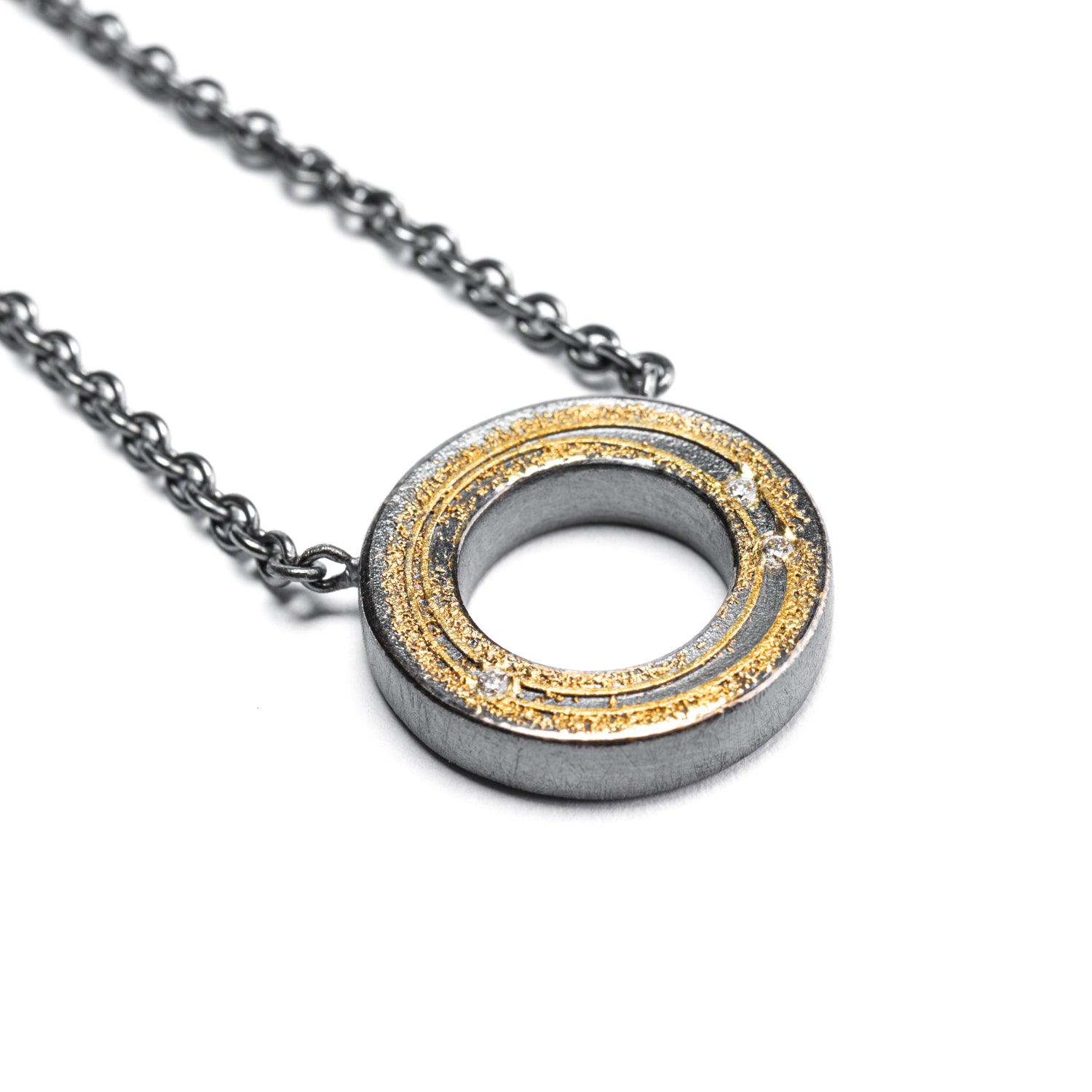 A larger version of the "O" Necklace, 0.7 inches in diameter, this oxidized sterling silver, 24k gold and diamond necklace is a perfect daily wear piece, alone or layered. Wear or gift a "hug" from the Zobel XO collection. Enjoy it as a sweet sentiment, or admire it for its purity of shape, the warm luxury of pure gold and just the right amount sparkle. The total length including the oxidized sterling chain is 20.3 in. Toggle closure. Shown with the small version of the "O" Necklace, sold separately.