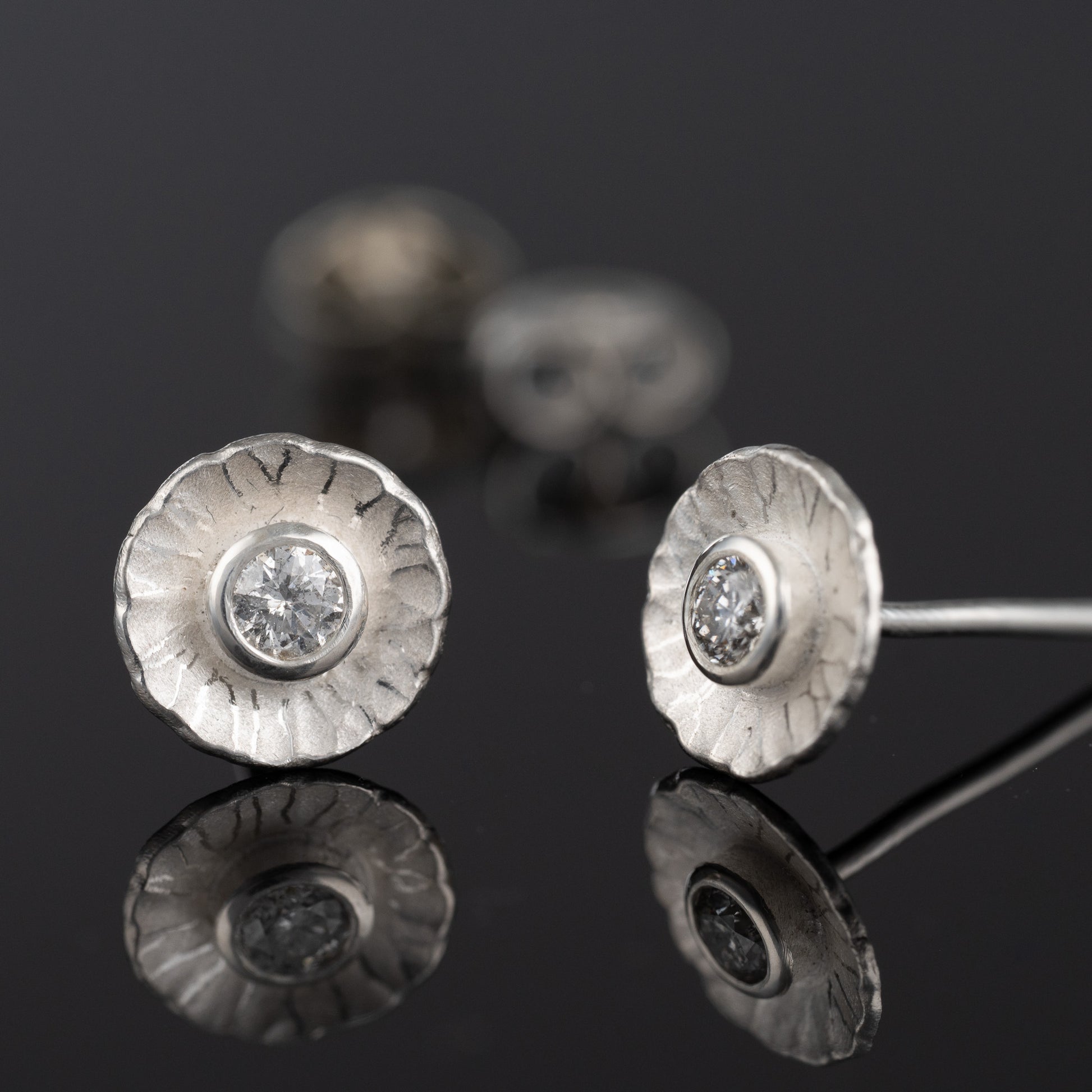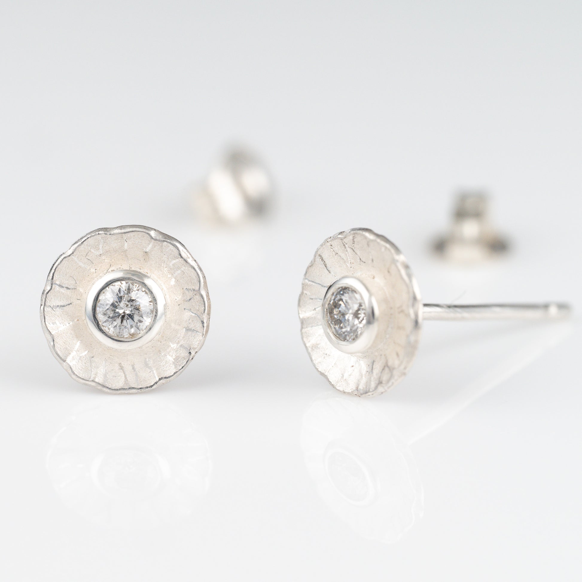 Hammer textured and burnished sterling silver post earrings, bezel set Australian silvery-white diamonds from Argyle Mine (0.16ctw). They measure 8mm (0.31") in diameter.