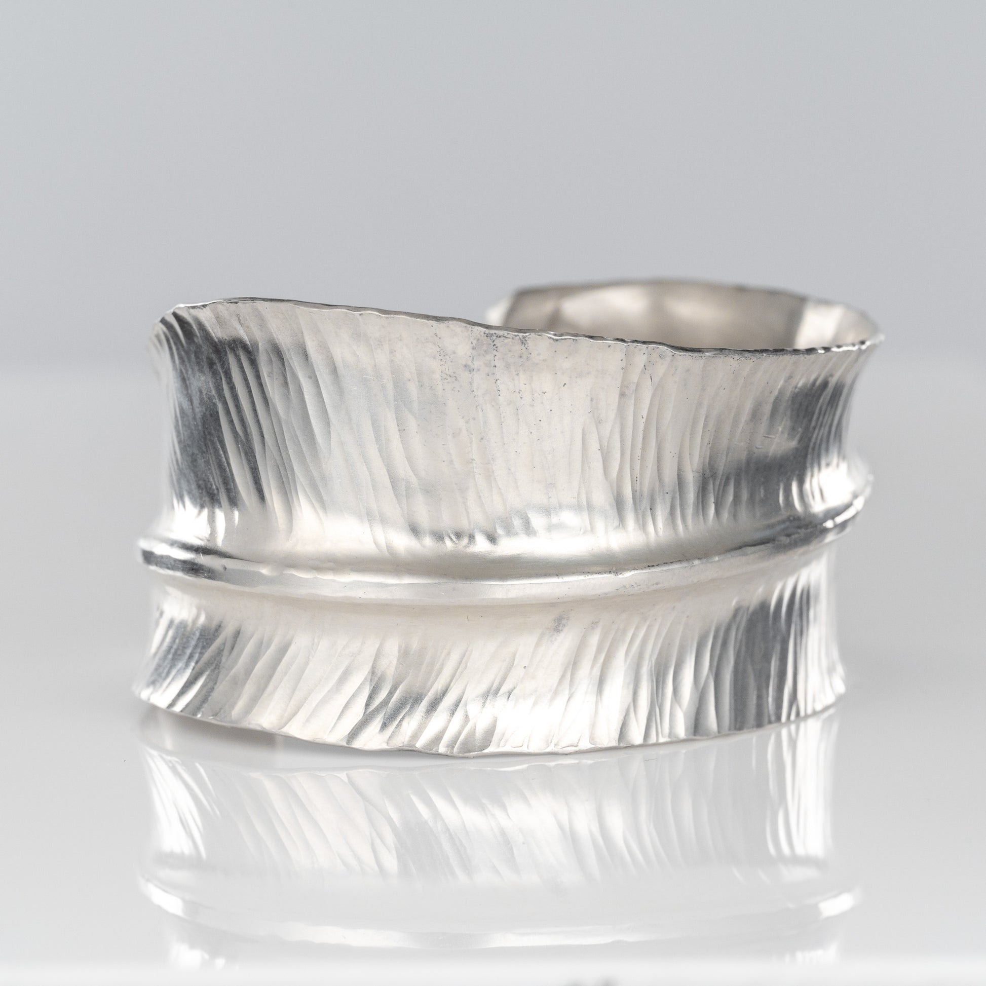 Hammer and fold formed, this 1.5 inch wide tapered cuff bracelet is designed to be worn on the right hand.