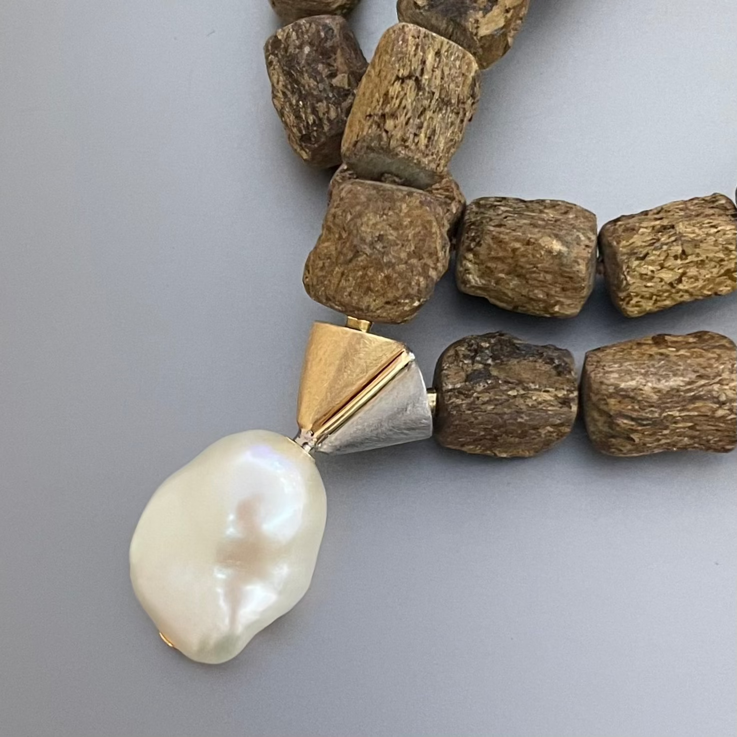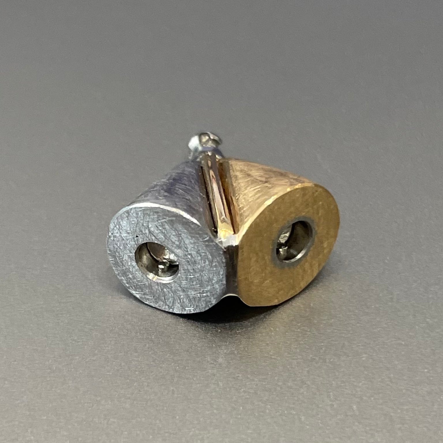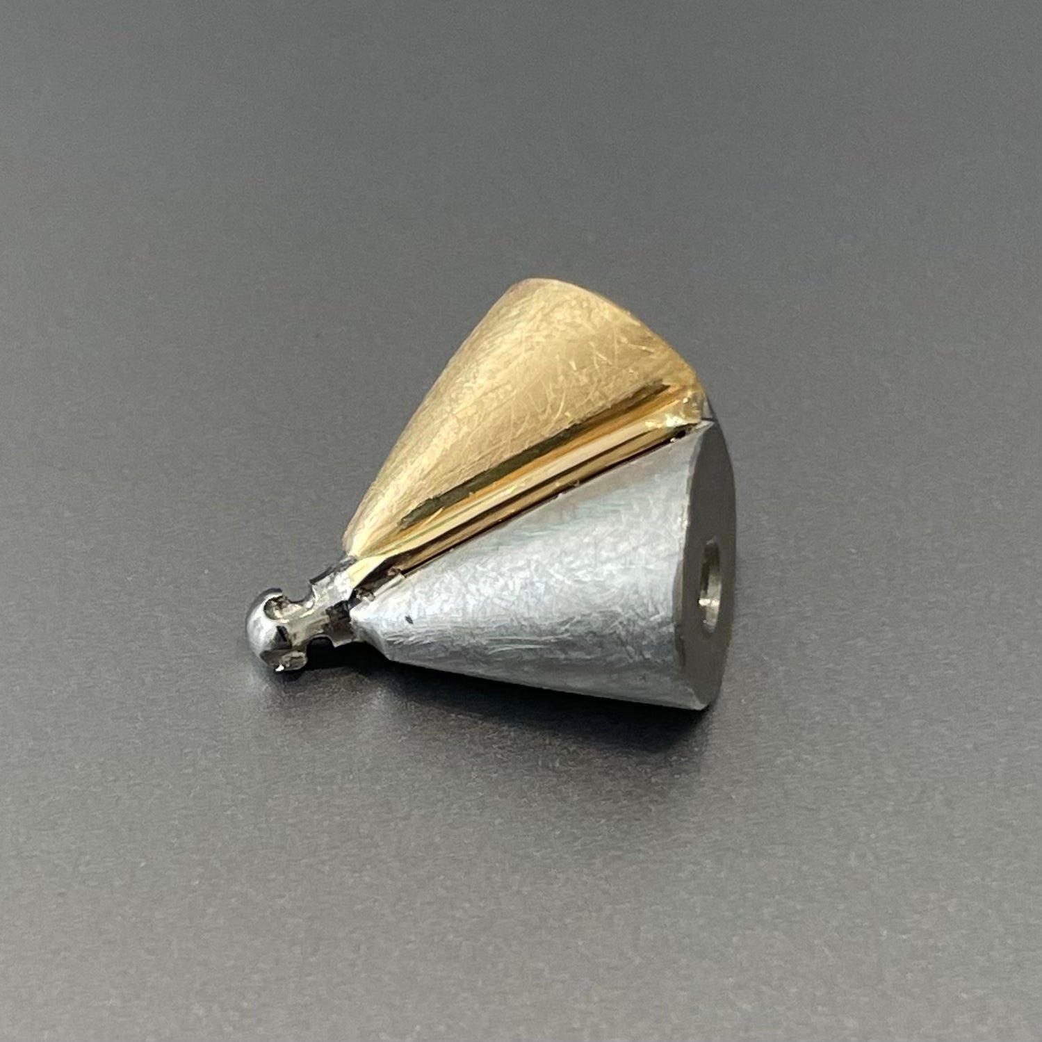 Solid 18k yellow gold and stainless steel, this is a larger "Y" connector which suitable for Vario pearl or gemstone bead strands, or for larger diameter neck cords. Overall height 16mm, diameter of cones at point of necklace attachment is 8.5mm. Create the elongated "V" shape and feel of a pendant, expanding your Vario wardrobe options even more!