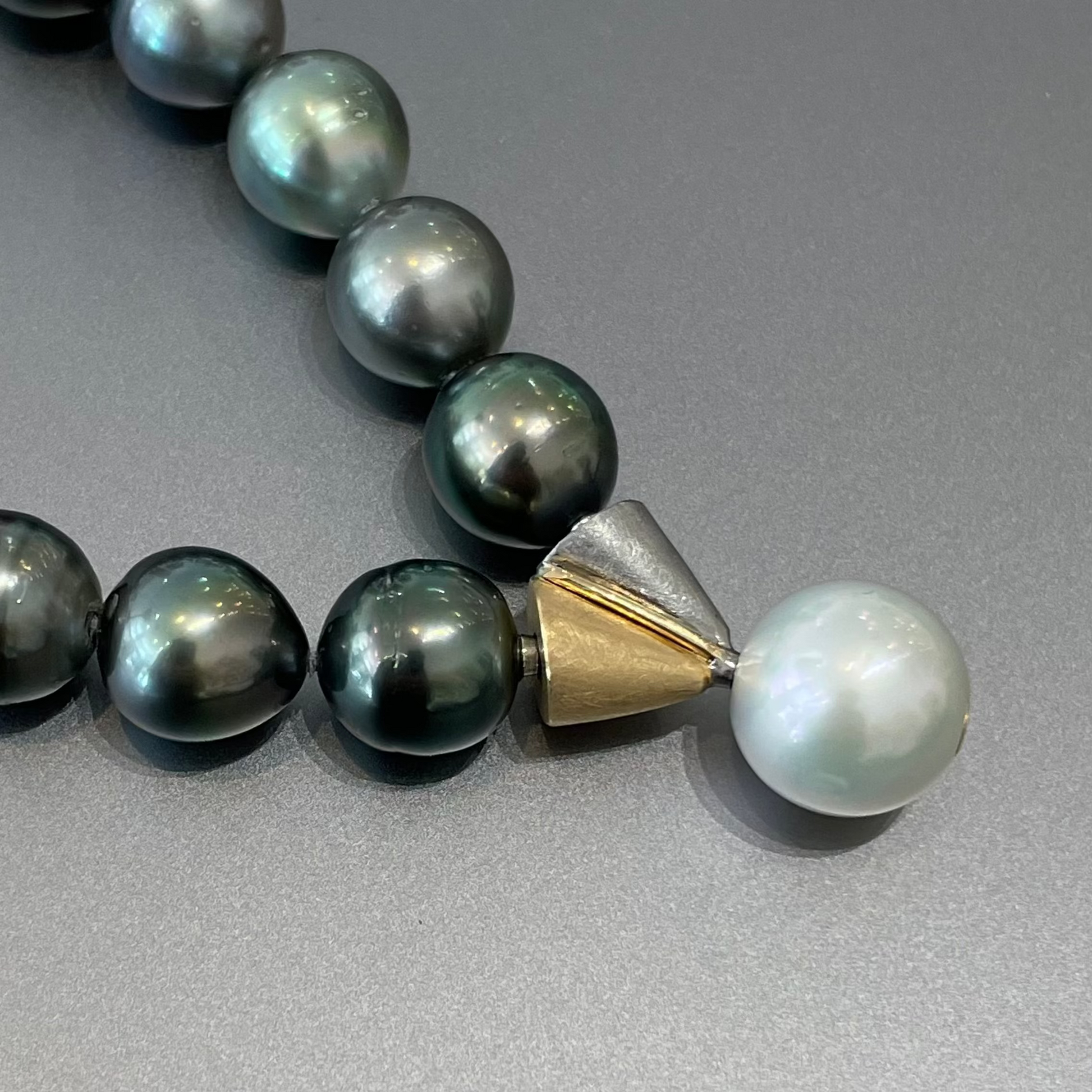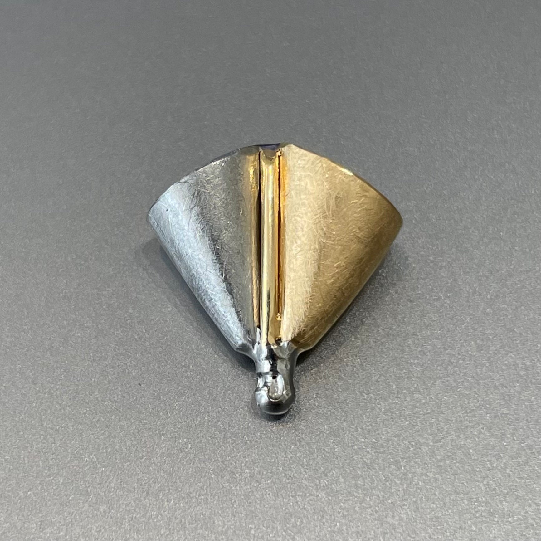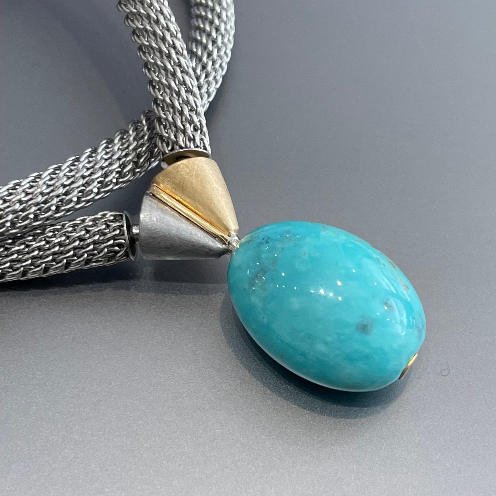 Solid 18k yellow gold and stainless steel, this is a larger "Y" connector which suitable for Vario pearl or gemstone bead strands, or for larger diameter neck cords. Overall height 16mm, diameter of cones at point of necklace attachment is 8.5mm. Create the elongated "V" shape and feel of a pendant, expanding your Vario wardrobe options even more!