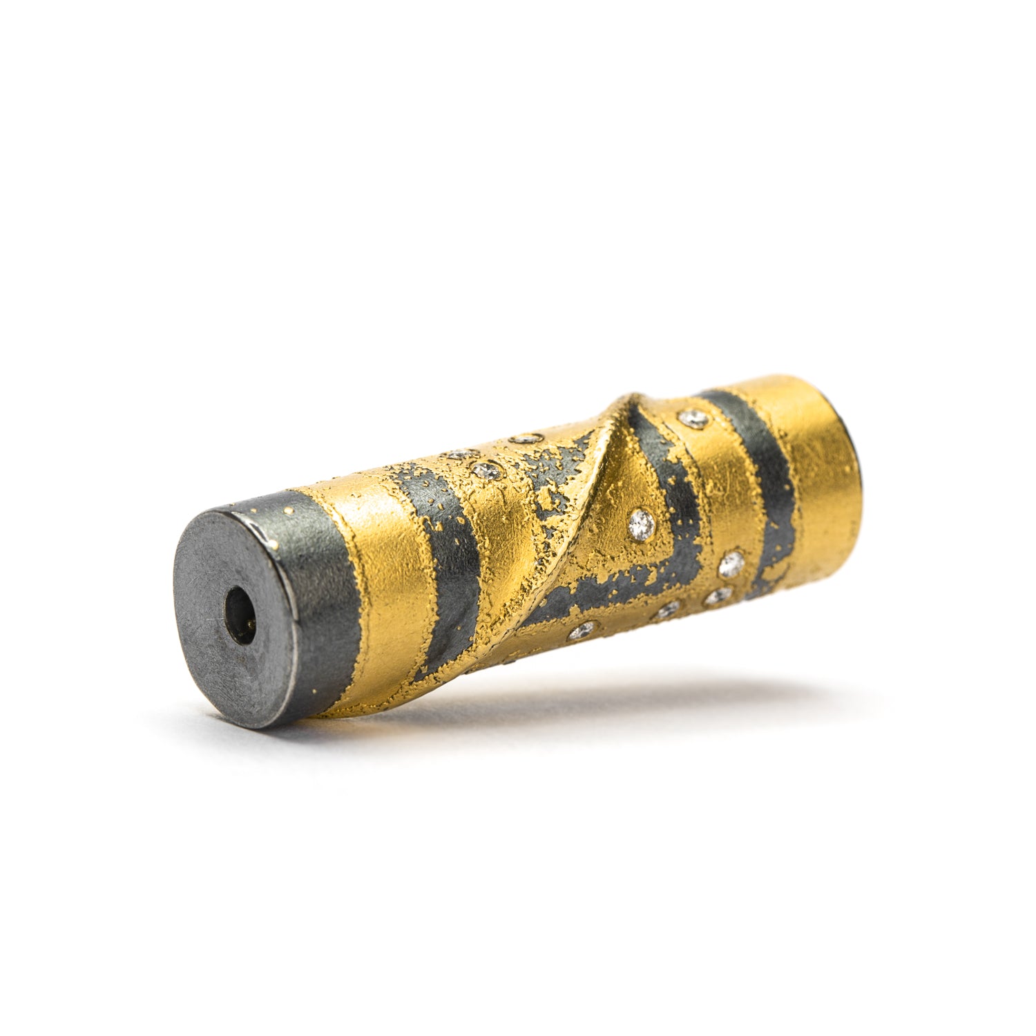 Interchangeable necklace clasp for the Vario System. A bold, geometric design in 24k gold on an oxidized sterling silver cylinder clasp with 0.13 CTW white faceted diamonds (G/VSI). Pair with your favorite new Atelier Zobel Vario necklace from our collection, or mix and match to expand your own Vario System wardrobe. 1.3 inches long and 0.4 inches in diameter.