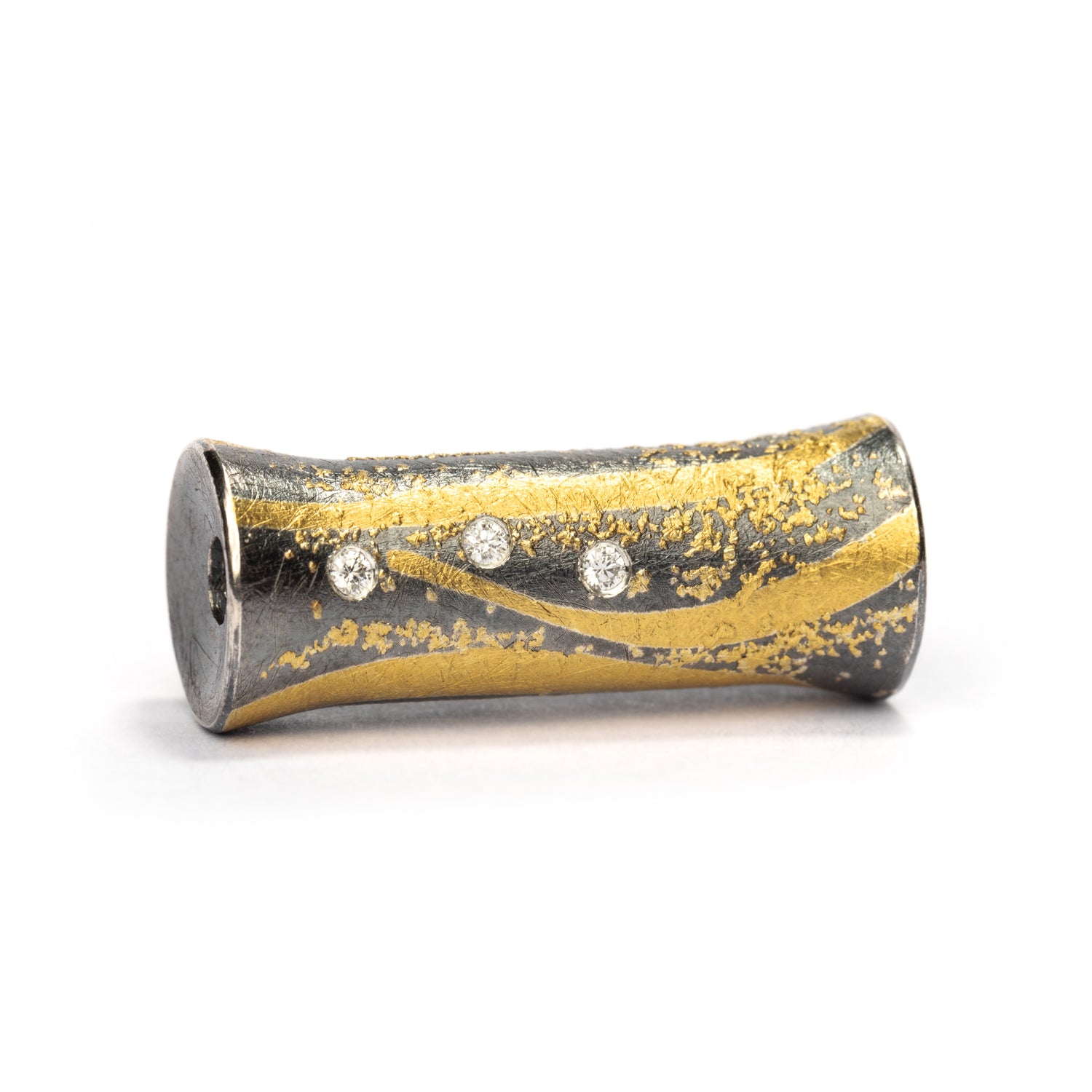 Interchangeable necklace clasp for the Vario System. A sculpted cylinder of oxidized sterling silver and 24k gold with 8 faceted white diamonds to pair with your favorite Vario System pearls or necklace. See the Atelier Zobel options in our collection, or expand your own Vario suite. Length 0.9 in, diameter 0.4 in.